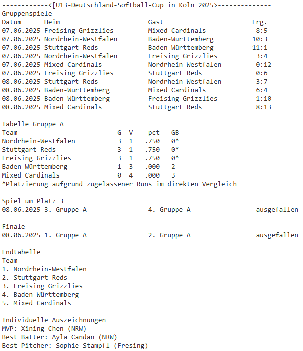 Die NRW-Auswahl hat den U13-Softball-Deutschland-Cup am 7. und 8. Juni 2025 in Köln gewonnen. Platz 2 ging an die Stuttgart Reds, Rang 3 belegten die Freising Grizzlies. In der Vorrunde konnten alle drei Teams jeweils drei Siege und eine Niederlage verbuchen. Die Platzierung erfolgte daher aufgrund der zugelassenen Runs im direkten Vergleich. Auf dem vierten Platz landete die BaWü-Auswahl (1-3), Platz fünf ging an die Mixed Cardinals (0-4).