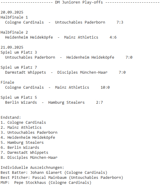 Die Cologne Cardinals haben die Deutsche Meisterschaft Baseball der Junioren (U18) in Paderborn und Verl gewonnen. Die Cardinals setzten sich im Finale des Dreitagesturniers gegen die Mainz Athletics mit 10:0 durch.